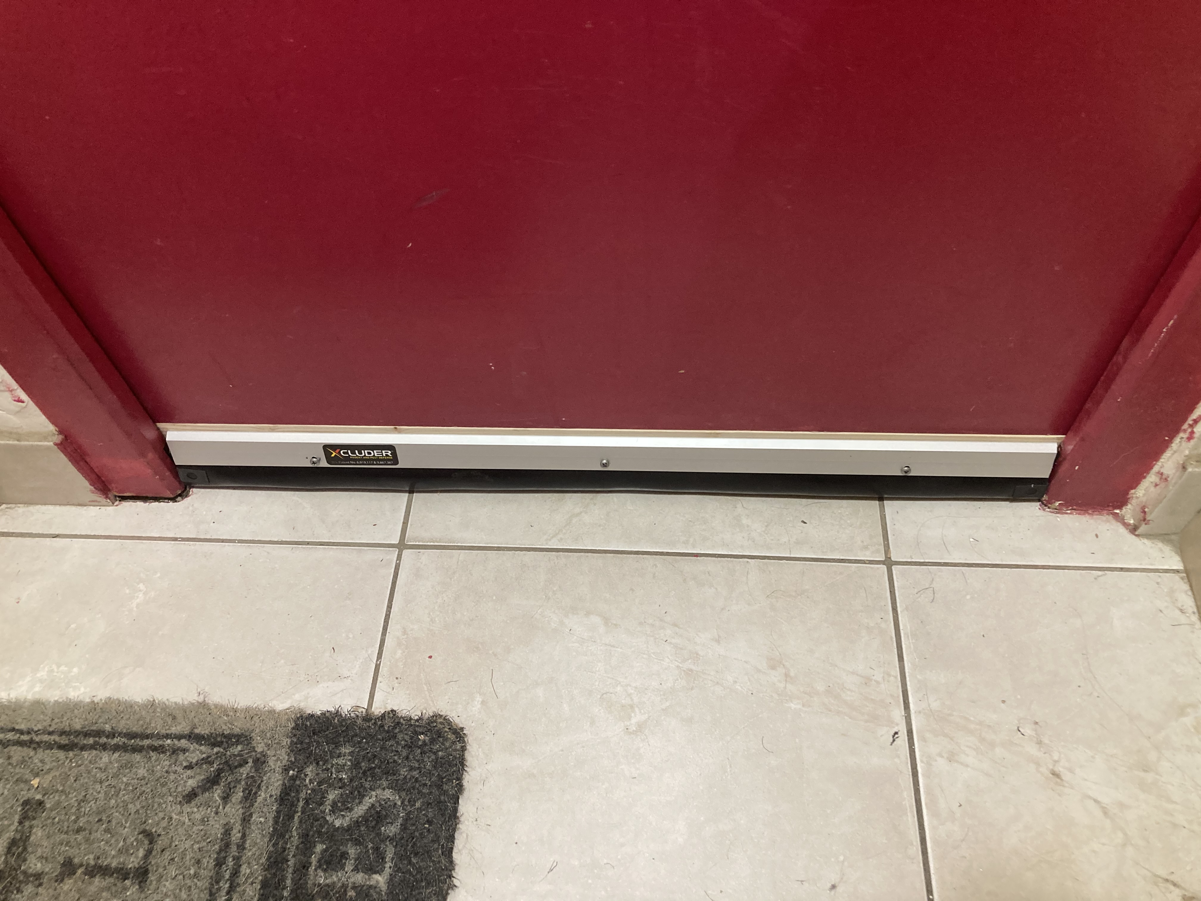 Mise en place d’un balai de porte « X-CLUDER » anti rongeur pour combler l’espace entre le sol et la porte (des rats et souris passaient en dessous avant la pose)